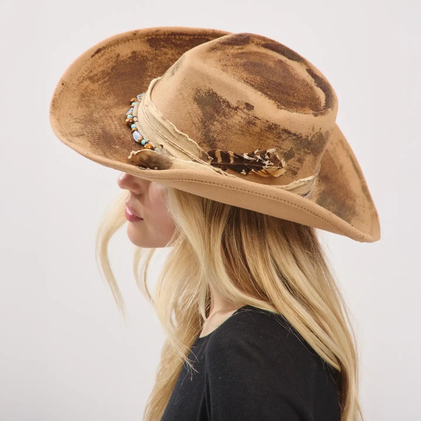 • Rustic cowgirl fedora hat with feather and distressed fabric band