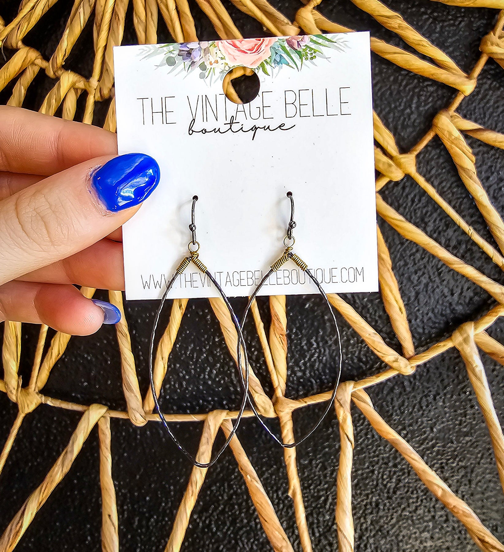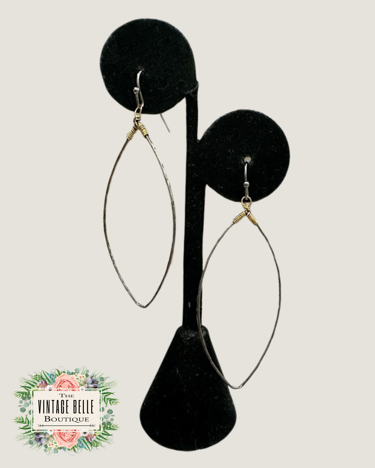 These oval wire dangle earrings feature a teardrop design and are made of wire in a worn silver or hematite finish. Measuring at approximately 2 inches, these wire drop earrings add a unique and stylish touch to any outfit.