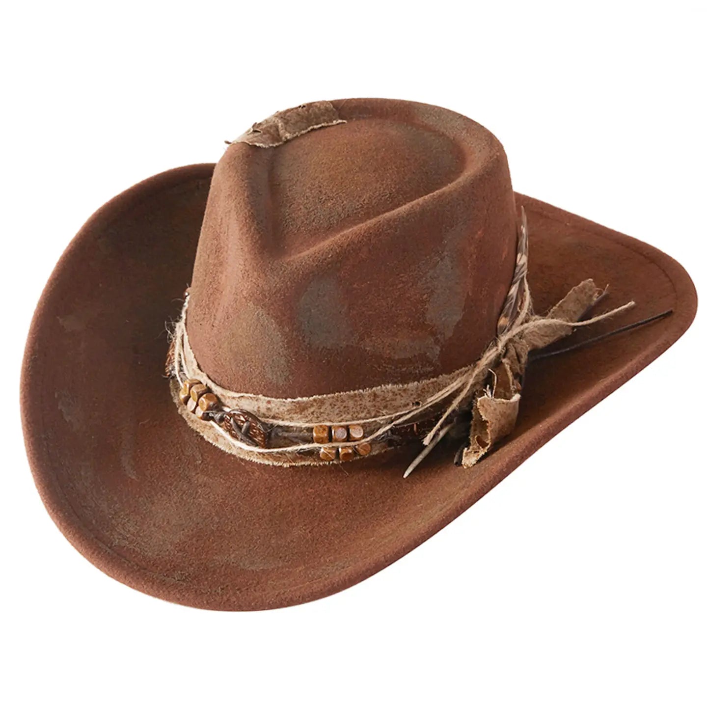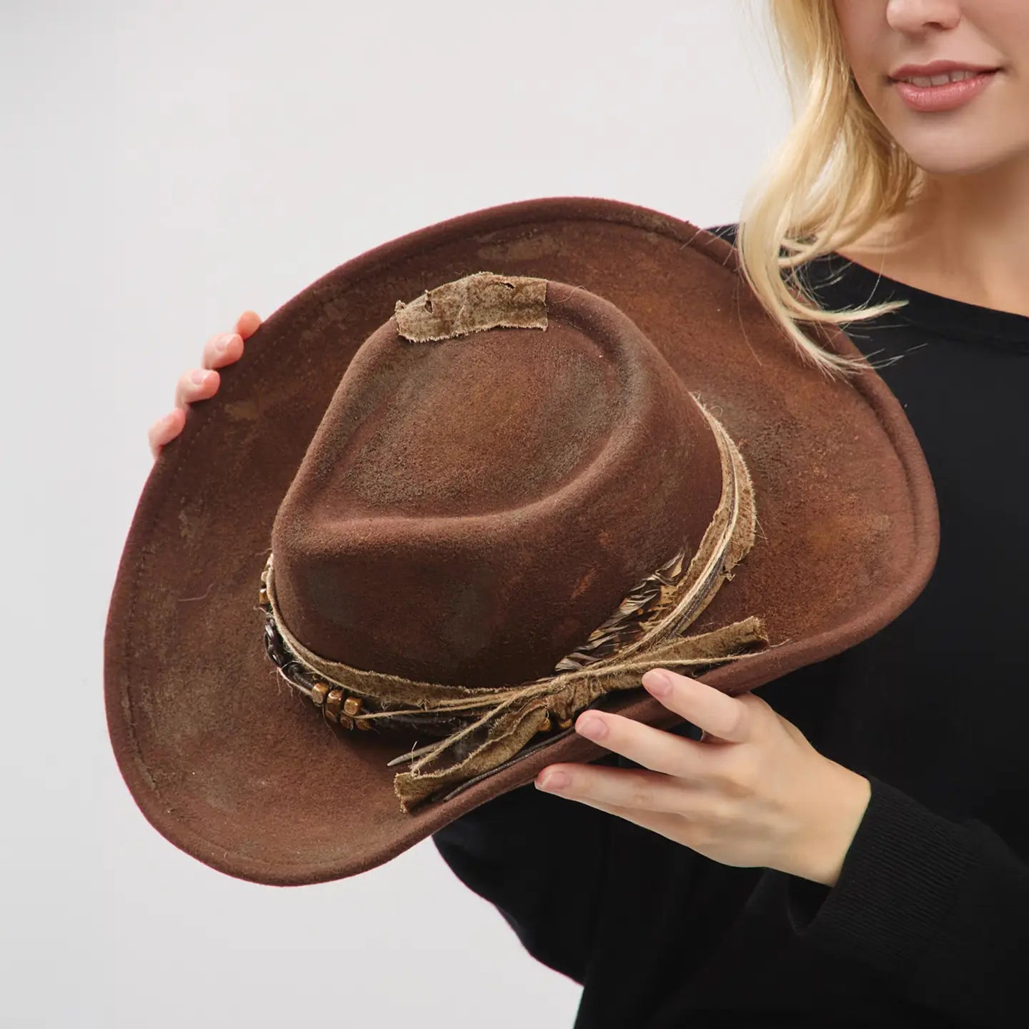 • Rustic cowgirl fedora hat with feather and distressed fabric band