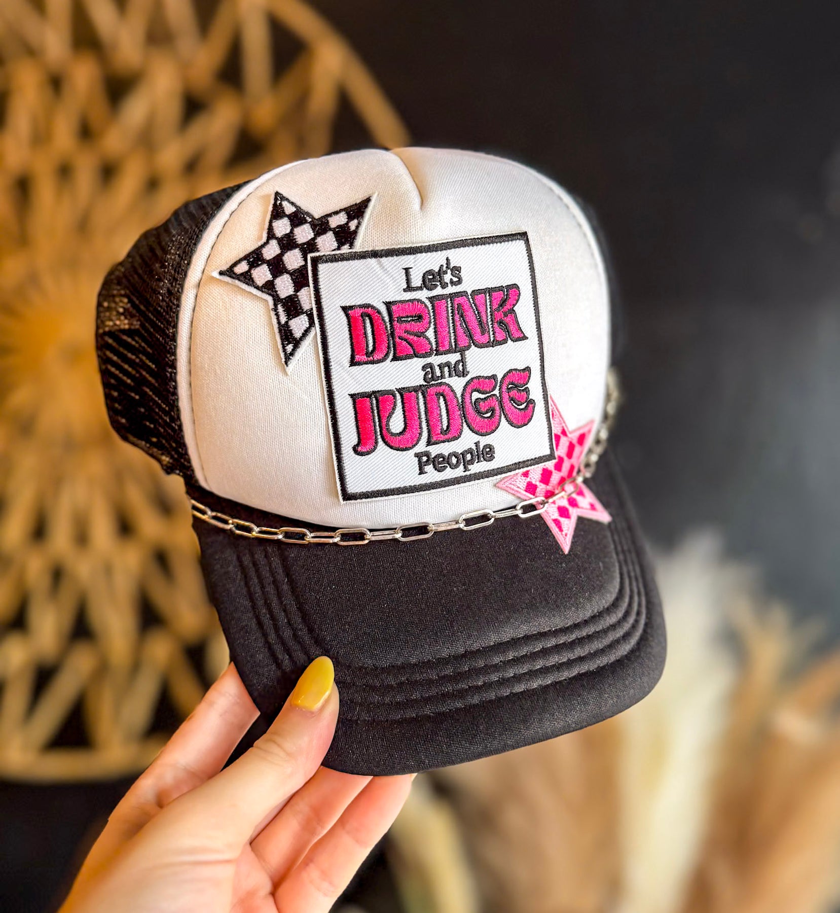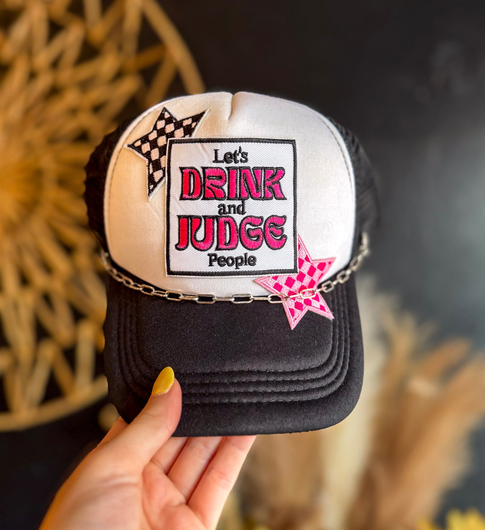 Pink "Lets Drink and Judge People" patch design with other star patches