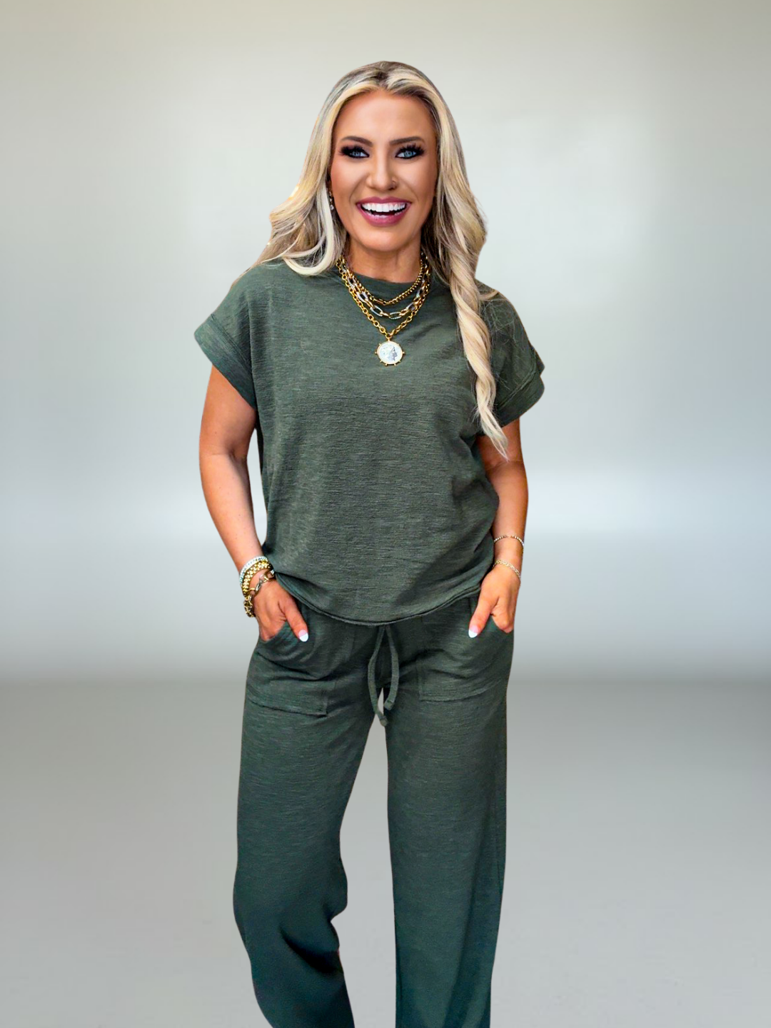• Cotton slub short sleeve tee and long pants set designed for easy, everyday comfort