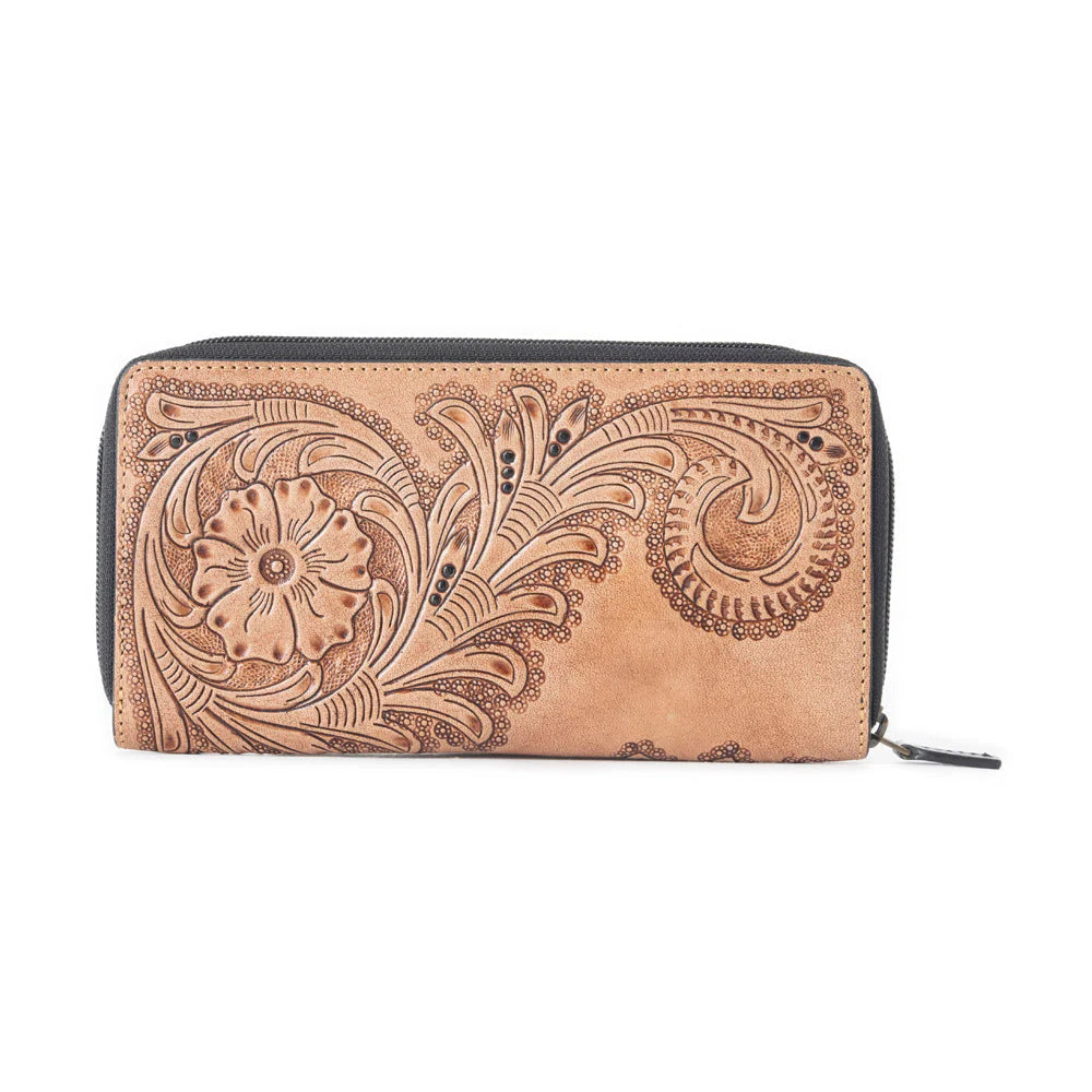 Sandy-toned leather wallet featuring an elegant floral and vine–inspired embossed design