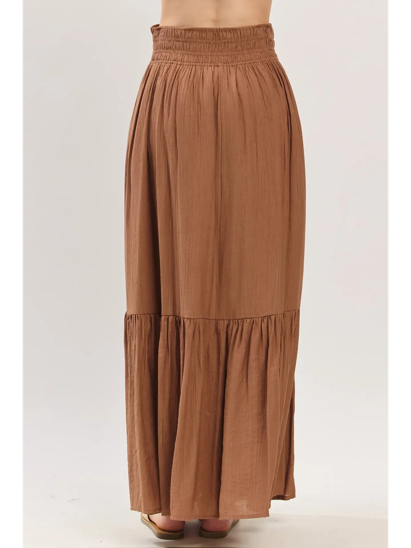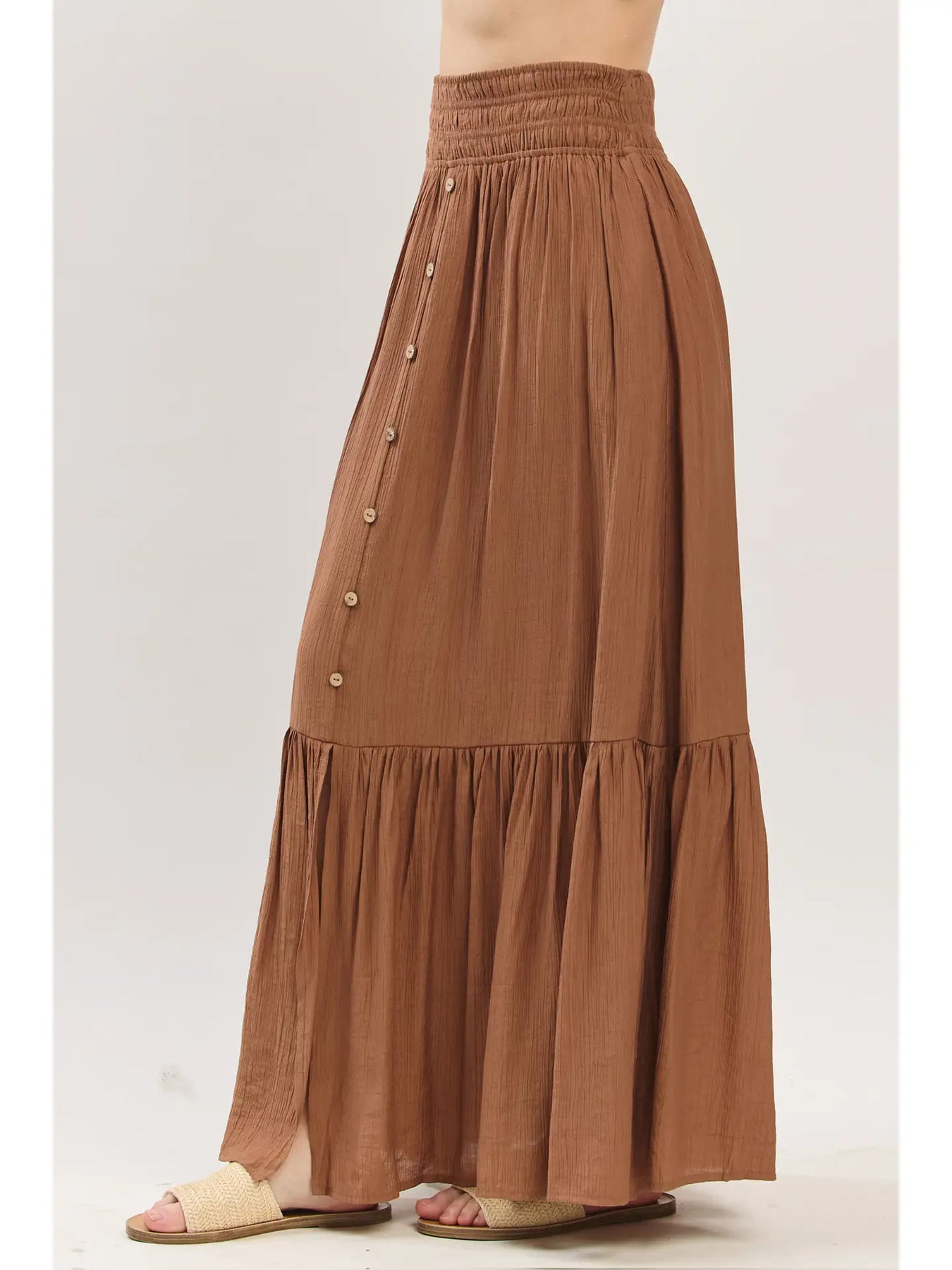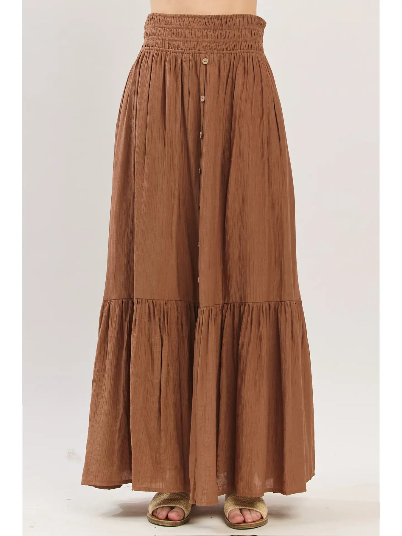 Details: Smocked waist Center slit Button-down front Tiered maxi skirt Available in brown, black, and olive Fit: Maxi length Relaxed, flowy silhouette Materials: Self: 85% Rayon, 15% Nylon Lining: 100% Polyester