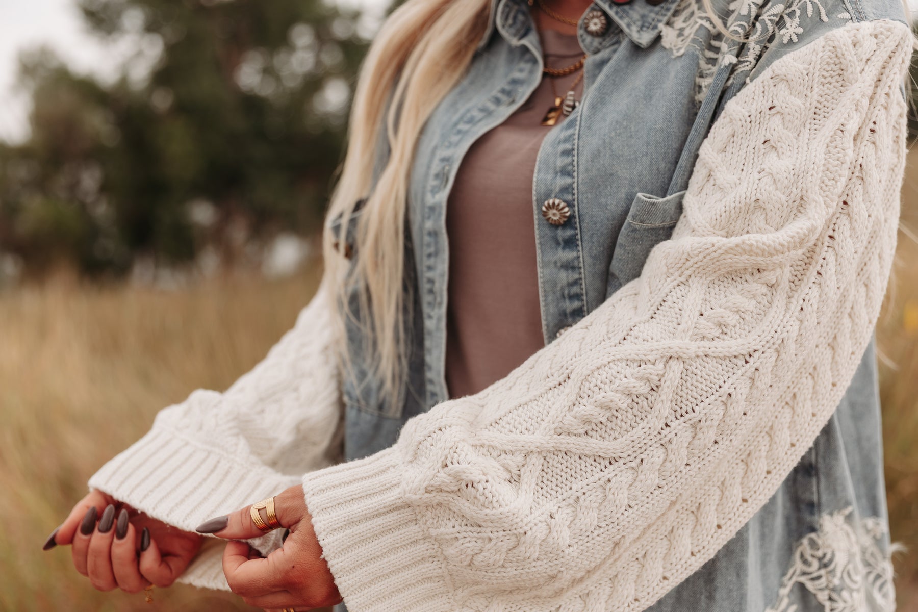 Contrast cable knit sleeves for cozy vibes