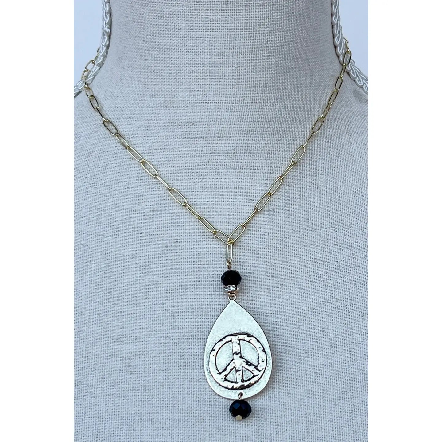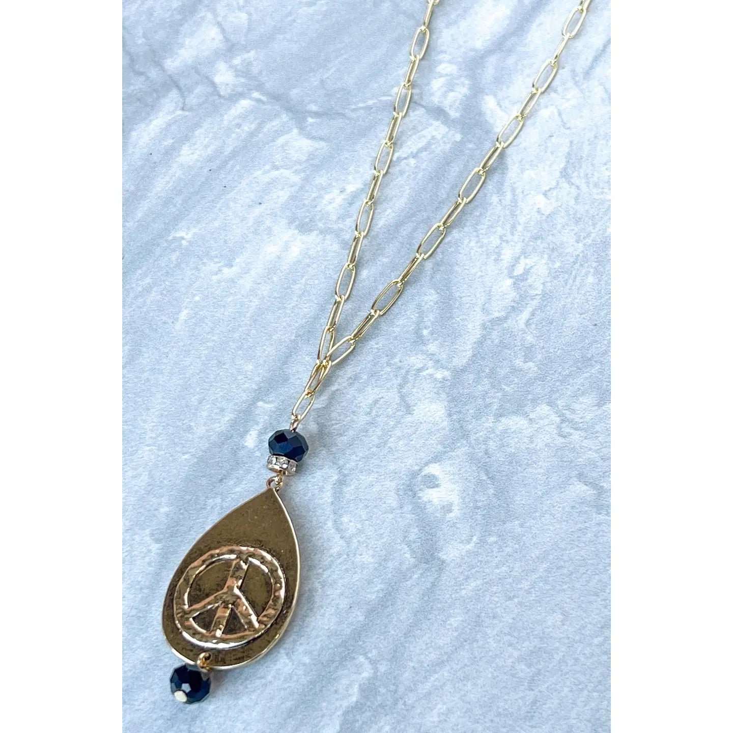 Teardrop-shaped pendant with an engraved peace sign on the front