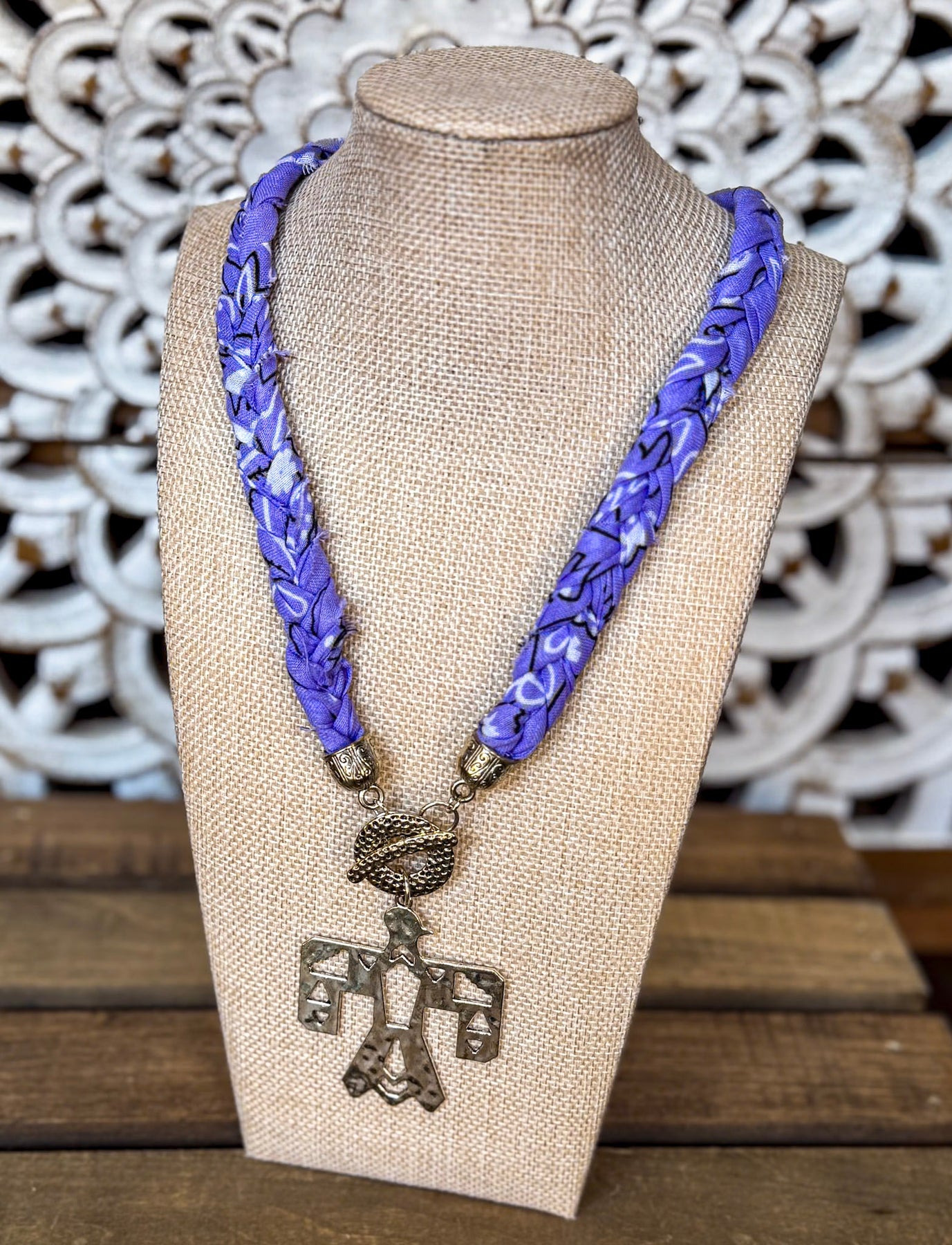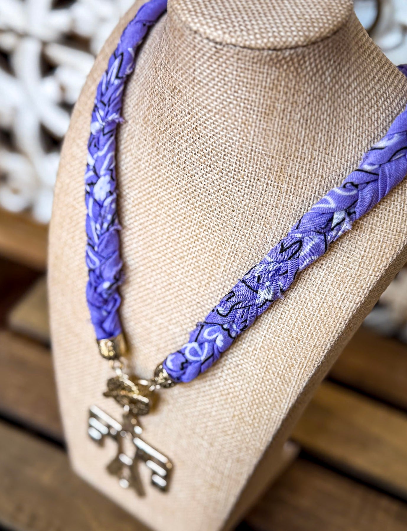 Artist-made necklace with a turquoise or light purple bandana fabric