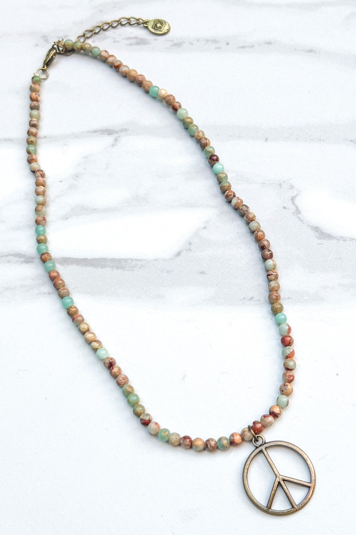 Short, adjustable necklace featuring small imperial jasper stone beads