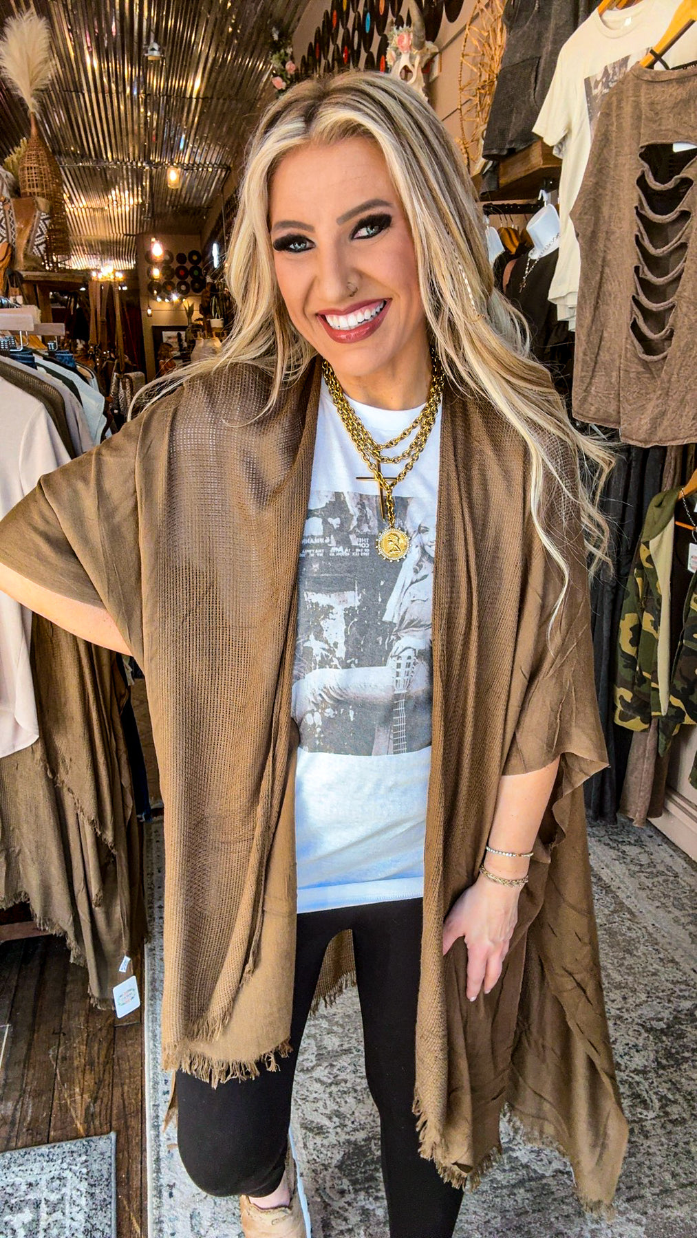 Flowing, boho-inspired kimono in a rich olive hue