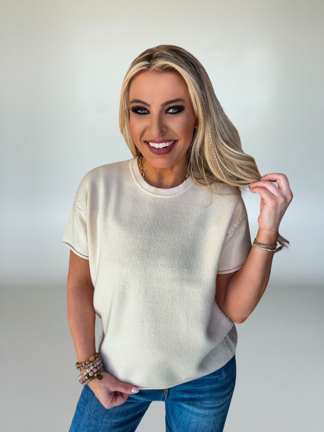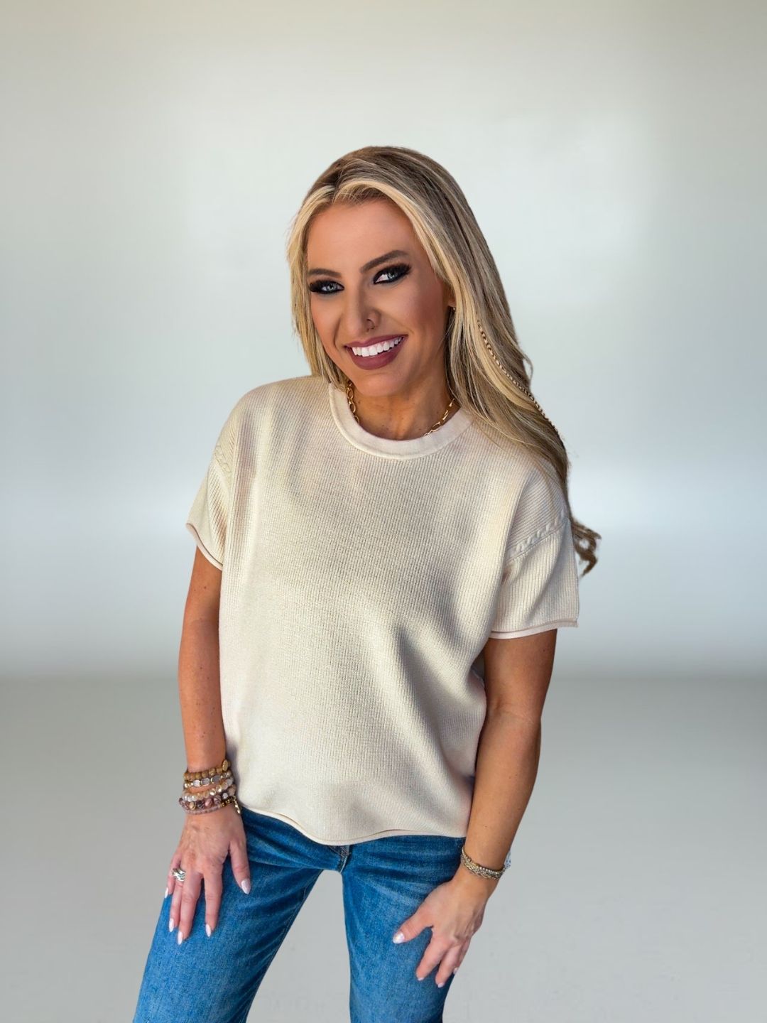 Short sleeves create an easy, transitional style ideal for layering or wearing on its own