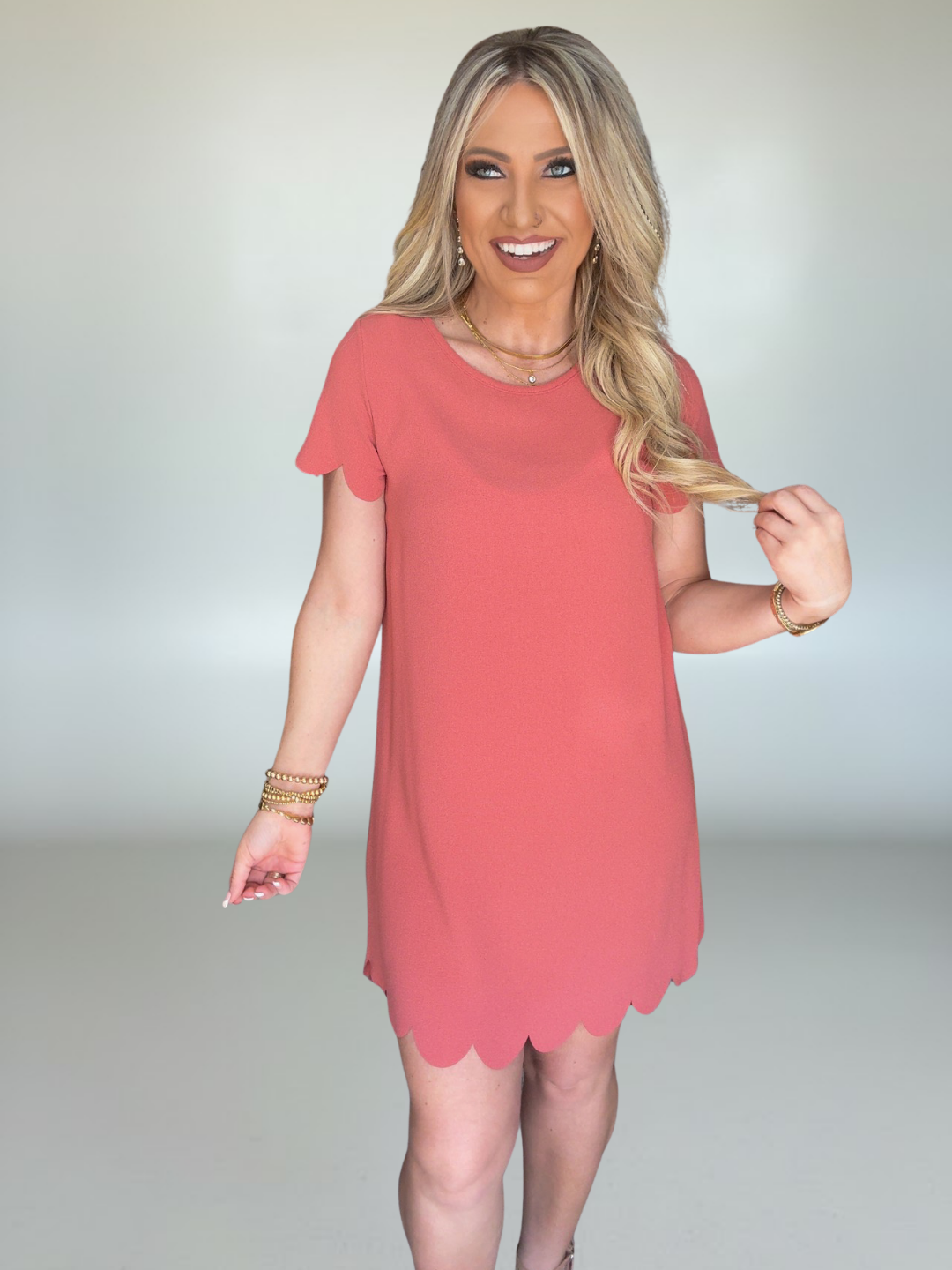 Solid short sleeve dress featuring delicate scalloped detailing along the hem and sleeve edges for a soft, feminine finish