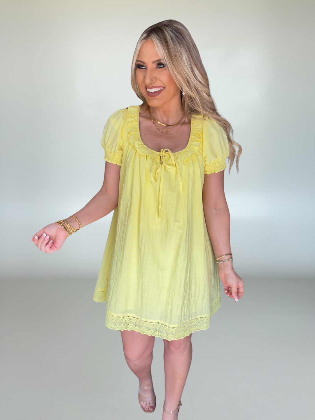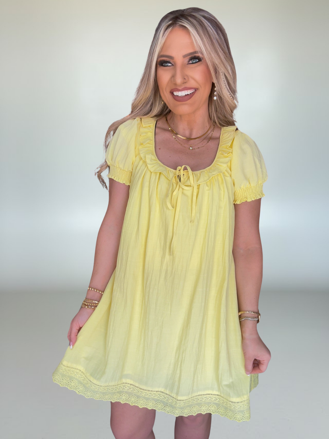 • Woven short sleeve mini dress featuring playful ruffle accents for a soft, feminine, and charming look