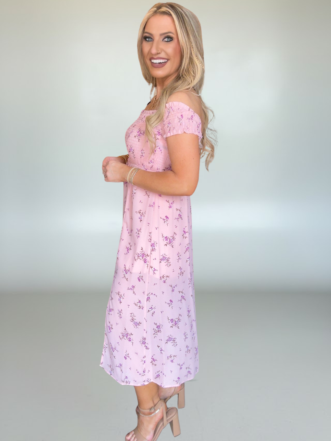 Off-the-shoulder smocked neckline provides a flattering, adjustable fit and adds soft, elegant charm