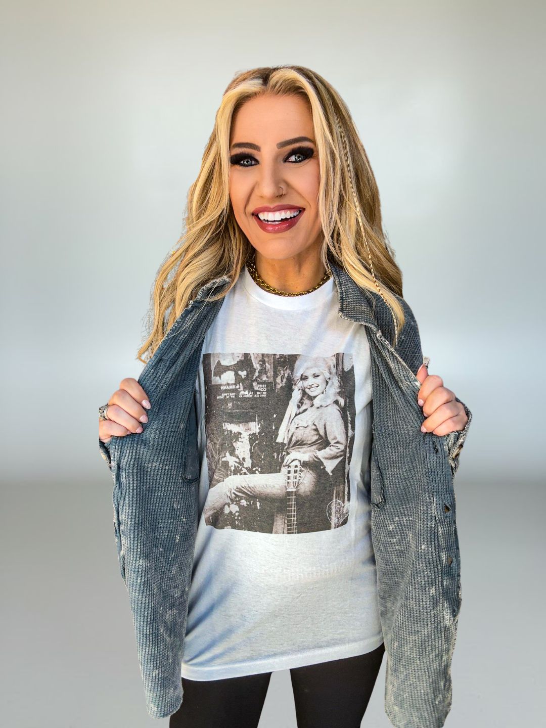Features a classic black-and-white Dolly Parton graphic with timeless appeal