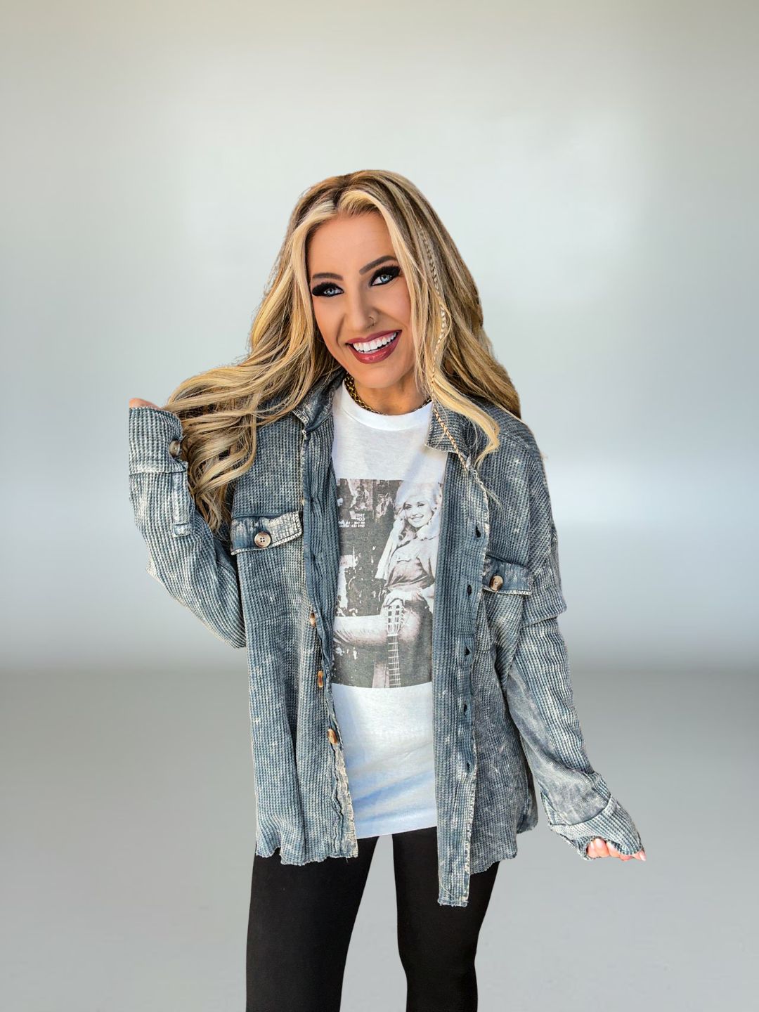 • Button-up front for versatile styling and easy layering