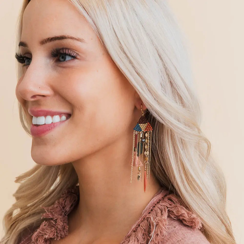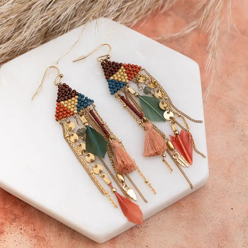Vibrant beads and playful feathers create a whimsical, bohemian cascade