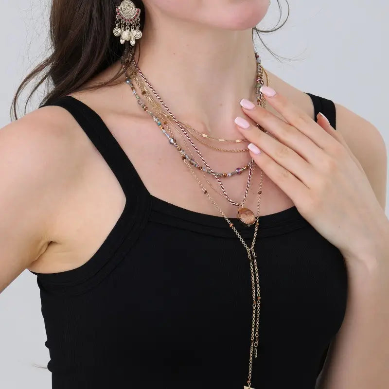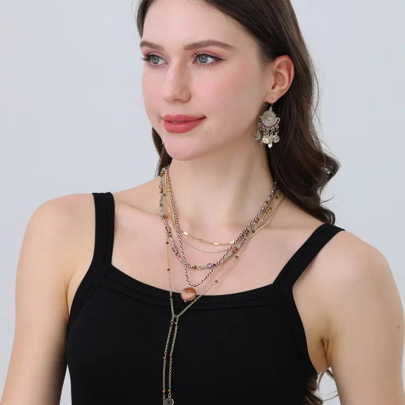 Multi-strand layered necklace featuring gold-toned chains, iridescent beads, and a statement stone charm