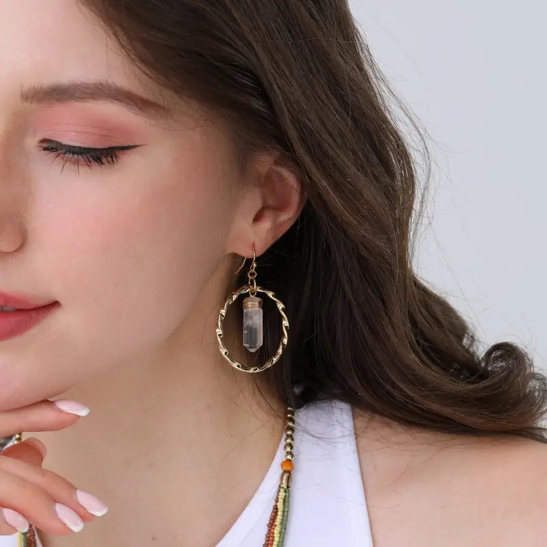 Twisted gold hoops adorned with a single suspended clear quartz-style charm