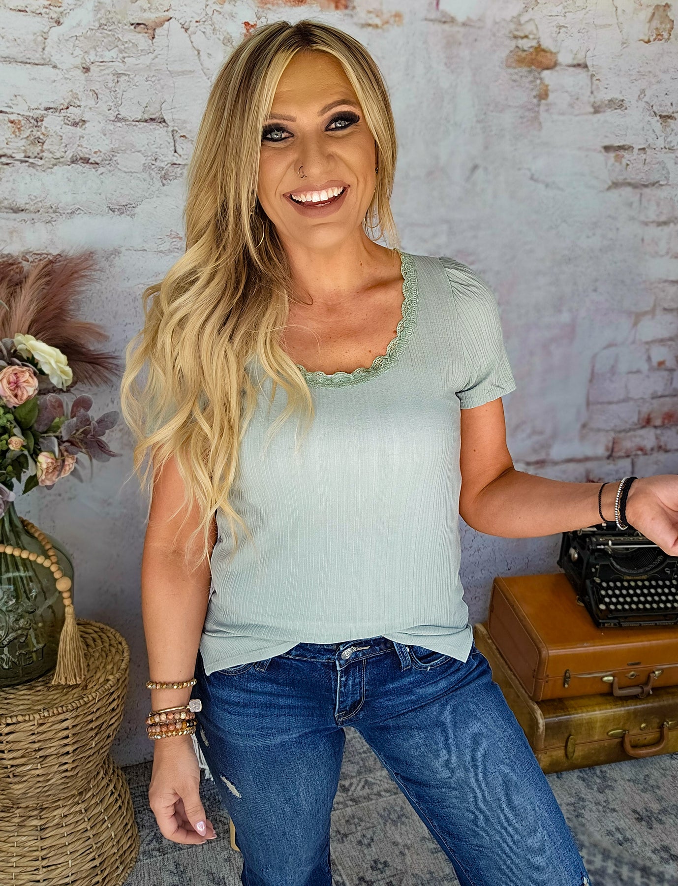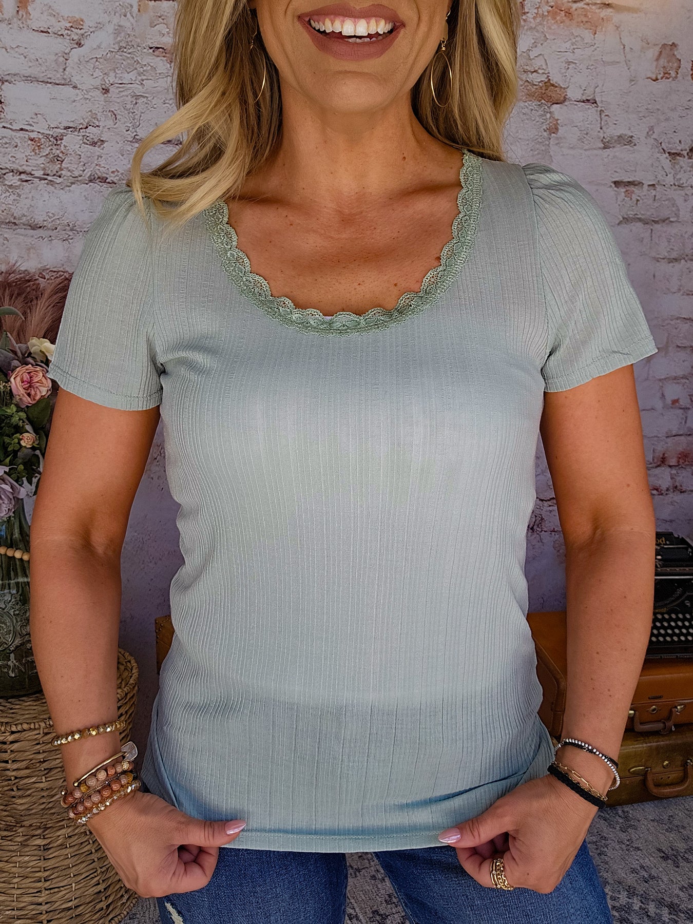 Sweet with a touch of sass, this top brings all the charm. Made from airy, semi-sheer fabric, it features a delicate laced neckline and mini puff sleeves that add just the right amount of drama. It’s flirty, floaty, and far from basic—aka your new go-to when cute and comfy is the vibe.