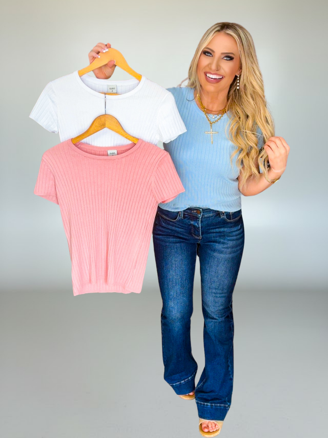 • Available in blue, dusty pink, and white for soft, versatile styling options