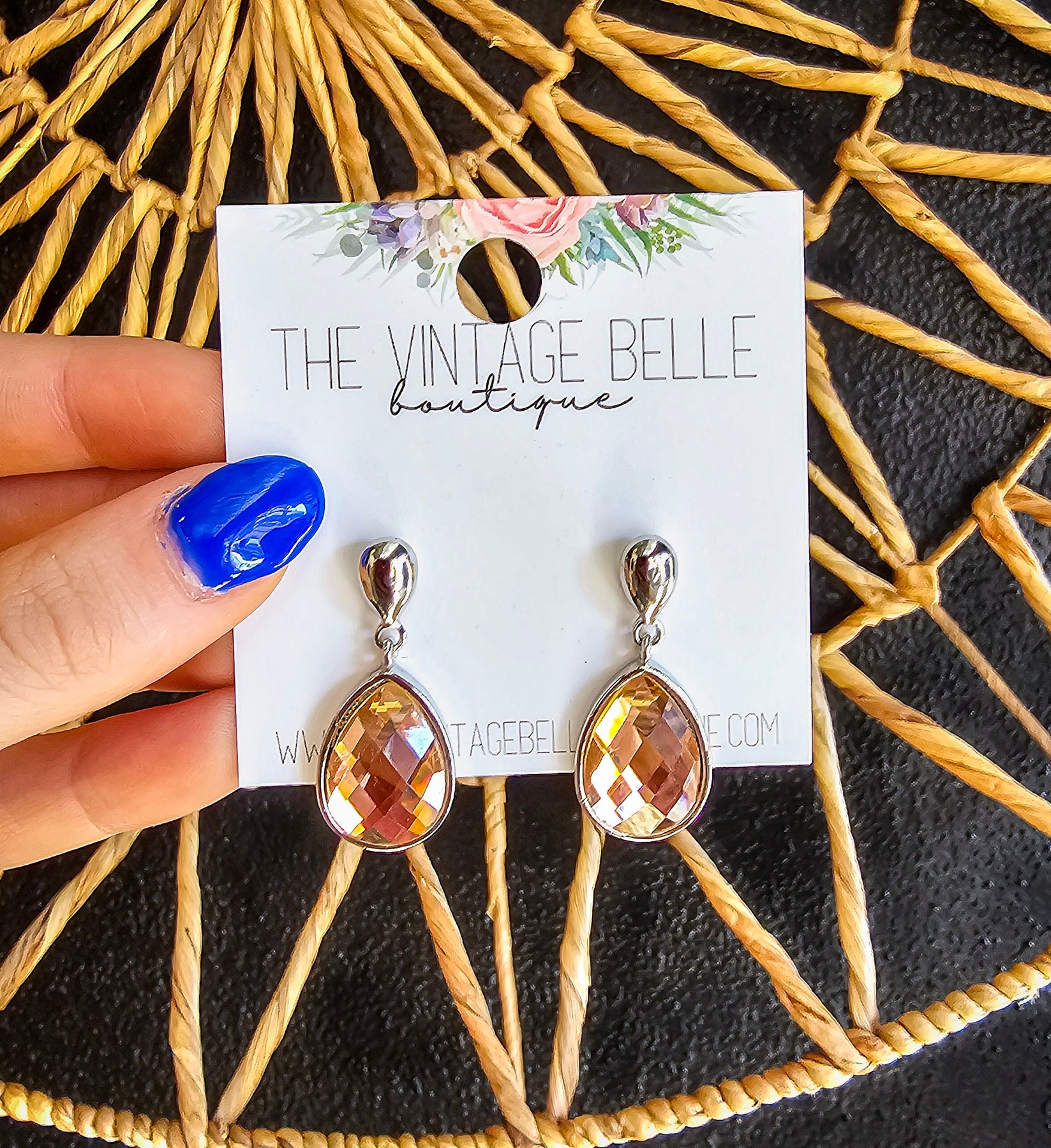Indulge in a touch of elegance with our Teardrop Champagne Crystal Gem Earring. Made from sparkling champagne crystals, these 1 1/4" earrings are beautifully crafted into a timeless teardrop shape. The perfect accessory for any occasion, these earrings add a touch of simple yet sophisticated style to any outfit.